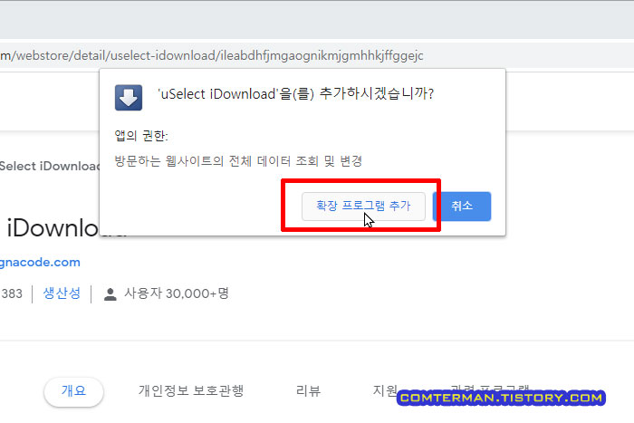 uSelect iDownload 플러그인을 추가할 것인지 묻는 팝업창에서 [확장 프로그램 추가] 버튼을 클릭합니다.