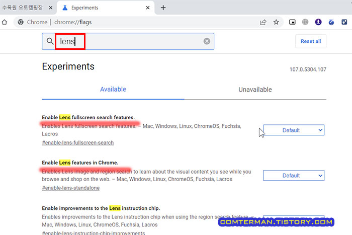 크롬 브라우저의 [Experiments] 페이지가 뜨면, 상단 검색창에 [lens]를 입력합니다.
