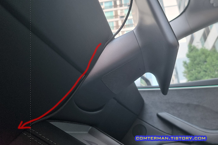 이렇게 전면 모니터에서부터 센터 콘솔 옆면 커버 안쪽으로 USB-C 충전 케이블을 밀어 넣으면서 뒷 좌석 모니터 까지 진행했고, 모니터 하단의 USB-C 포트에 전선을 연결한 뒤, 밖으로 나와 있는 USB-C 충전 케이블을 커버 안쪽으로 밀어 넣어 정리했습니다.